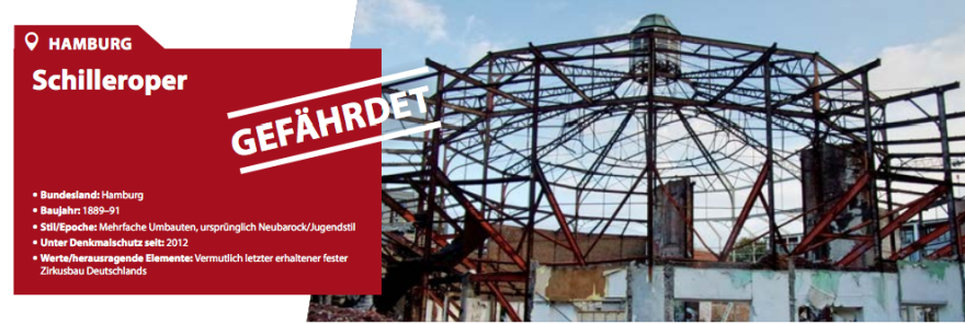 Die Stahlkonstruktion des Rundbaus ist das Zeugnis des letzten Zirkusgebäudes seiner Art aus dem 19. Jahrhundert in Deutschland. 1891 wurde es in Stahlskelettbauweise als festes Haus für "Circus Busch" errichtet. Danach wurde es zum "Schiller-Theater" und schließlich zur "Schiller-Oper". Die letzte öffentliche Aufführung in der imposanten Halle fand am 11. September 1939 statt. Später wurde das Gebäude u.a. als Kriegsgefangenenlager, Unterkunft für Asylsuchende und Autowerkstatt zweckentfremdet. Seit 2007 stand es leer. Im August 2022 hat die derzeitige Eigentümerin die historische Bausubstands der Schiller-Oper und die Nebengebäude abbbrechen lassen und damit das Gebäude skelletiert. Übrig geblieben ist die Metallkonstruktion - sie ist denkmalgeschützt. Die Schiller-Oper steht jetzt da wie bei ihrer Errichtung vor 134 Jahren! Viele Menschen in Hamburg, Deutschland und im Ausland fragen sich, wie das passieren konnte. 2018 gehörte das Gebäude sogar den Bauwerken, die als "European Cultural Heritage" ausgezeichnet wurden.